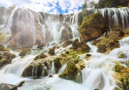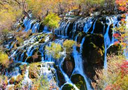 珍珠滩瀑布源自山中融化的雪水,它从高处冲进谷底,吼声如雷,卷起千堆浪花。这道激流水色泛白,是九寨沟所有激流中水势较猛,水声较大的一段。激流左侧栈道,是观赏瀑布的绝好地点。