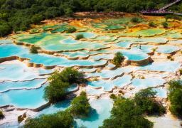 黄龙五彩池位于黄龙景区内,无数个大大小小的池子像是装满五彩颜料的调色盘,在阳光下光彩夺目,摄人心魄。